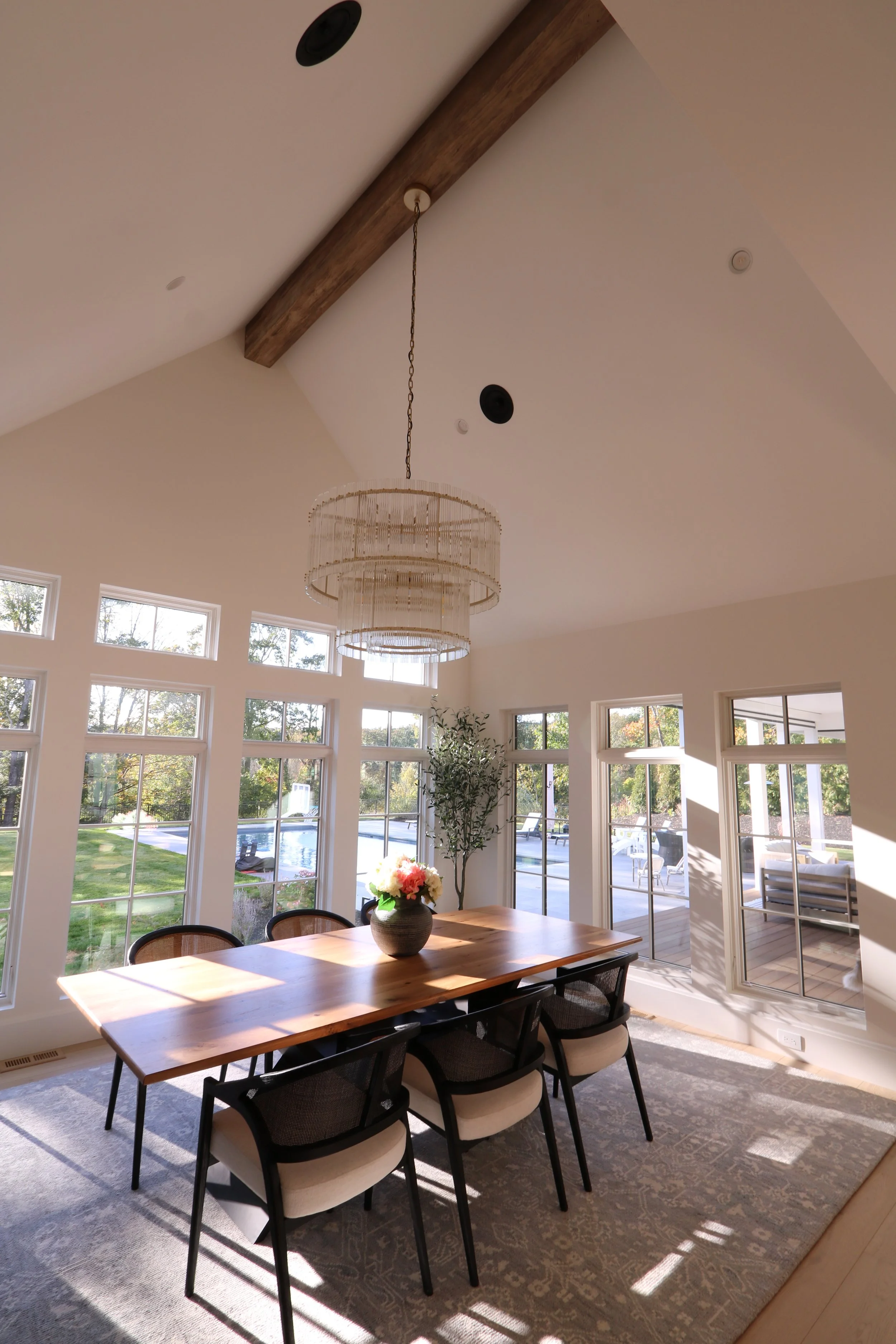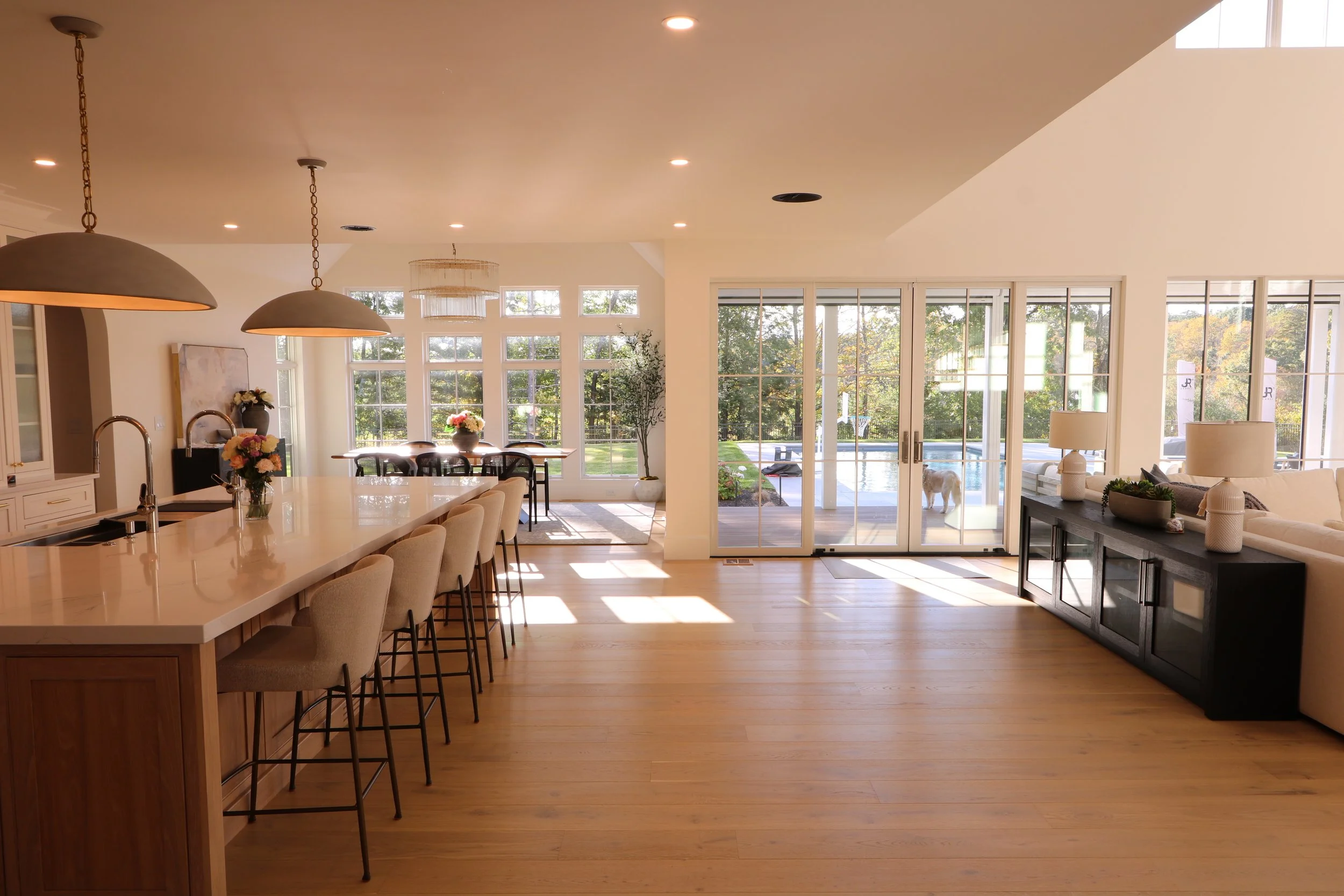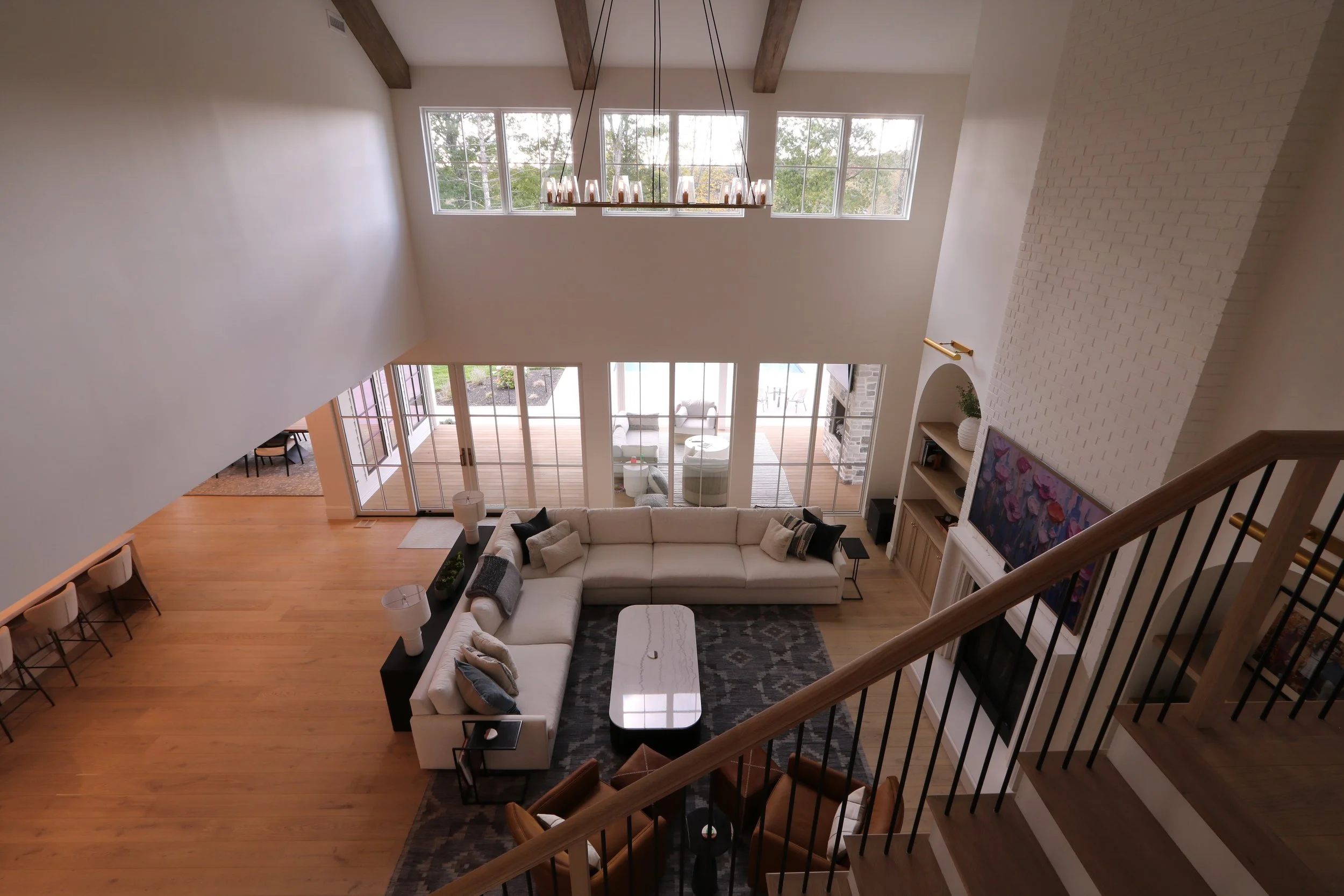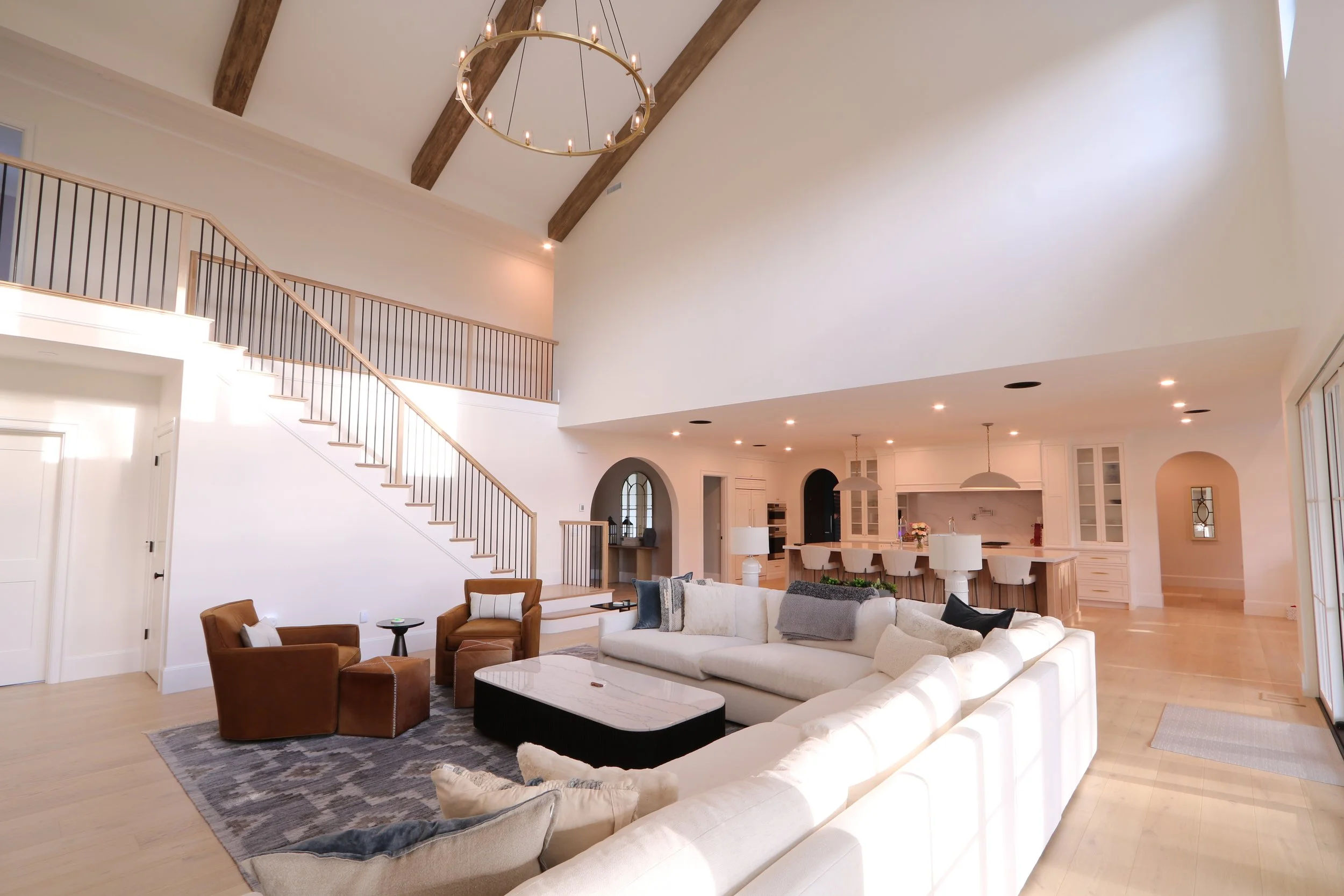 The homeowners’ priority for their fully custom new build house was to achieve the perfect interior flow and function. Views and connections to the exterior, particularly to the backyard, was very important and was achieved throughout the entire first and second levels. High pitched dueling gables and a sloped entry canopy, along with the selection of neutral exterior materials, provides a timeless aesthetic for this dream home.